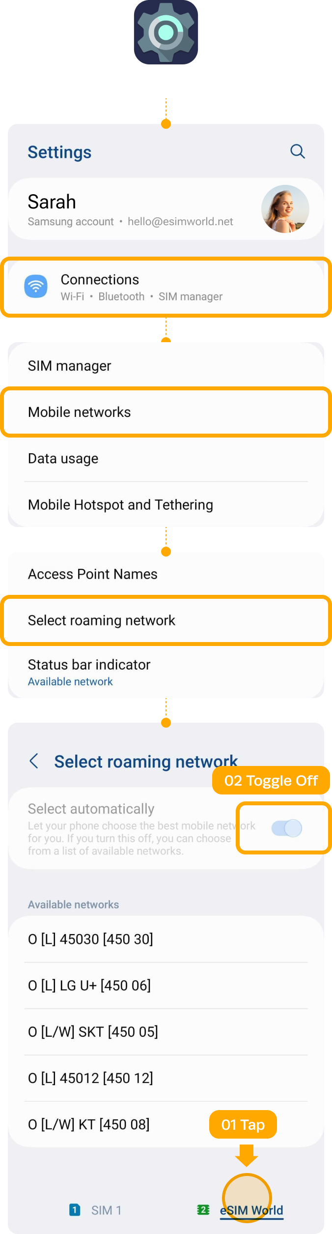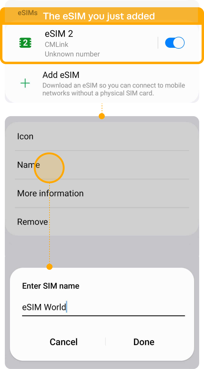 | ▸ | Choose the eSIM you just added Tap [Name] and Type on new label of your own, e.g. {Destination} – eSIM World. |